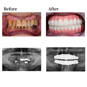 上顎骨の形状を整え、12,22の位置にノーマルインプラントを0度垂直埋入。15, 25 の位置にノーマルインプラントを30度傾斜埋入。下顎も形状を整え、45, 42, 32, 35の位置にそれぞれオールオン4インプラントを埋入。 42, 32の位置に、0度垂直埋入、45, 35の位置に17度傾斜埋入。その後、マルチユニットアバットメントで角度補正を行い、プロビジョナルレストレーション(審美的な仮歯)を装着した。