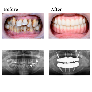 上顎骨の形状を整え、12,22の位置にノーマルインプラントを0度垂直埋入。15, 25 の位置にザイゴマインプラントを30度傾斜埋入。下顎も形状を整え、45, 42, 32, 35の位置にそれぞれオールオン4インプラントを埋入。 42, 32の位置に、0度垂直埋入、45, 35の位置に30度傾斜埋入。その後、マルチユニットアバットメントで角度補正を行い、プロビジョナルレストレーション(審美的な仮歯)を装着した。