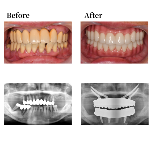 患者談。下顎を中心とした歯周病と、歯茎が下がっていることに深く悩まれていました。1本ずつインプラントを埋入するよりも、オールオン4の方が費用を抑えられると感じ、ネット検索で当院HPを見つけて来院されました。他院には相談せず当院のみを受診され、理事長より4本のザイゴマインプラントを併用するオールオン4の提案を受けました。説明を通じて治療への理解を深め、長年の悩みを解消するためにオペを決意されました。